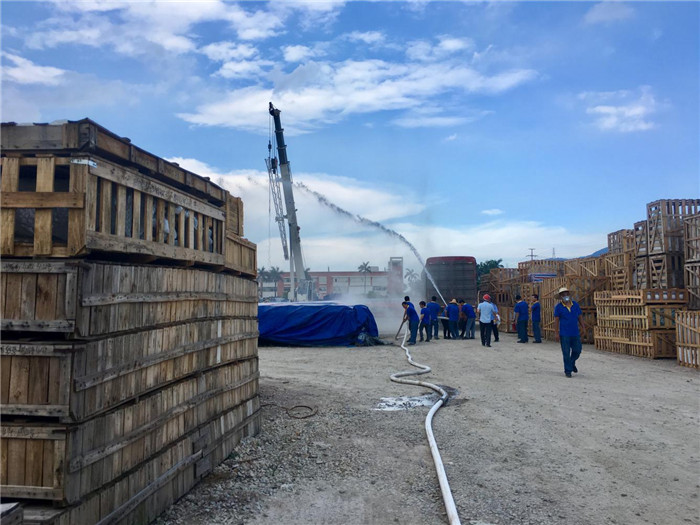 模擬火災現場消防演習設定30畝產品堆放區為著火點,分為四個組配合完成任務。第一組(滅火組)快速趕到事發地切斷電源,組員接好水帶水槍,用滅火器滅火;第二組(人員疏散組)組織疏散現場周圍人員,沿出口指示方向撤至一樓安全地方,保證樓道暢通,防止踩踏事故;第三組(人員物資搶救組)配合滅火組清理現場周圍物品,開辟防火隔離帶,救護傷員,用人工呼吸作簡單救治;第四組(照明、通訊組)配合其他三組負責場地照明、報警、模擬說明地址接警車、保證車道暢通到事發現場,滅火后留現場值班,防止二次火災發生。