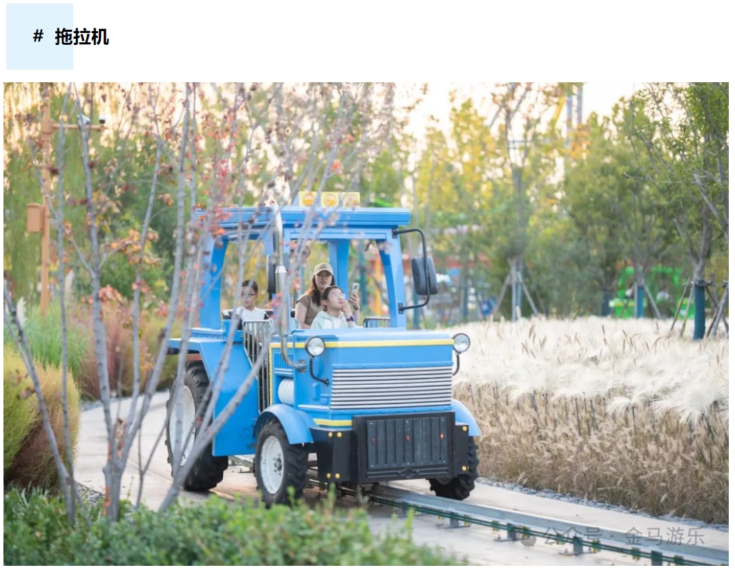 拖拉機是一款模擬農用拖拉機造型為主題的小火車類型設備,車輛外觀造型和內飾均逼真還原真實的拖拉機,孩子可以通過把玩方向盤,手動撥桿等部件體驗駕駛拖拉機的感覺,豐富孩子的認知,增加觀光游玩的趣味性。拖拉機每輛車設置4個座位,前排為兒童座,后排為成人座,一家人乘坐拖拉機穿梭在美麗的風景中,欣賞美景的同時共享天倫之樂。