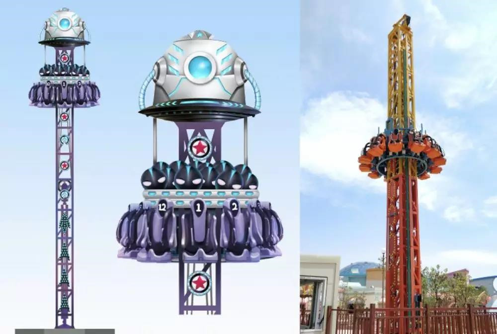 QWT-12D旋轉青蛙跳是一款塔類游樂項目,主要由塔體、塔底架、座艙組成,通過鋼絲繩,滑輪組和油缸帶動下,座艙可以在塔體上做上下移動。通過使用蓄能器和電氣控制,使座艙完成像青蛙一樣跳動的動作,讓游客經歷從失重,到減速,再到回彈等一系列連貫的動作,充分體驗到這種連貫跳躍的樂趣。除此之外,座艙結構分為內外圈,外圈乘客部分在跳躍過程中,還會隨著電機的帶動下旋轉,增加跳躍動作的復雜性,并增加游客的視覺空間。