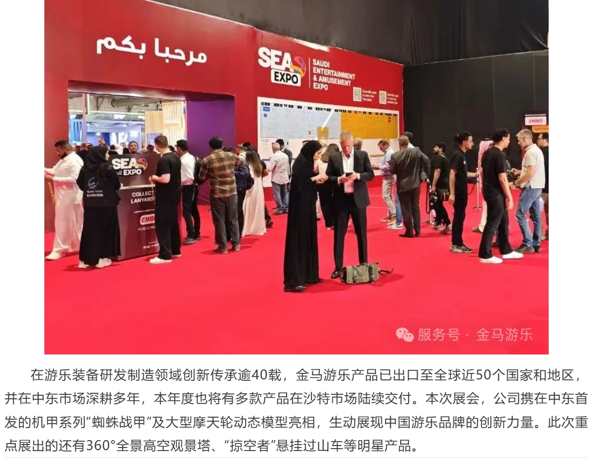 5月20日,全球游樂(lè)行業(yè)焦點(diǎn)之一的2025 SEA沙特展在沙特利雅得前沿會(huì)展中心盛大開幕。隨著“沙特2030愿景”加速推進(jìn),中東文旅產(chǎn)業(yè)將迎來(lái)黃金發(fā)展期。金馬游樂(lè)搶抓市場(chǎng)機(jī)遇,攜高品質(zhì)創(chuàng)新產(chǎn)品與全球服務(wù)方案閃耀亮相本次展會(huì),與全球伙伴共拓中東千億級(jí)市場(chǎng)新機(jī)遇!