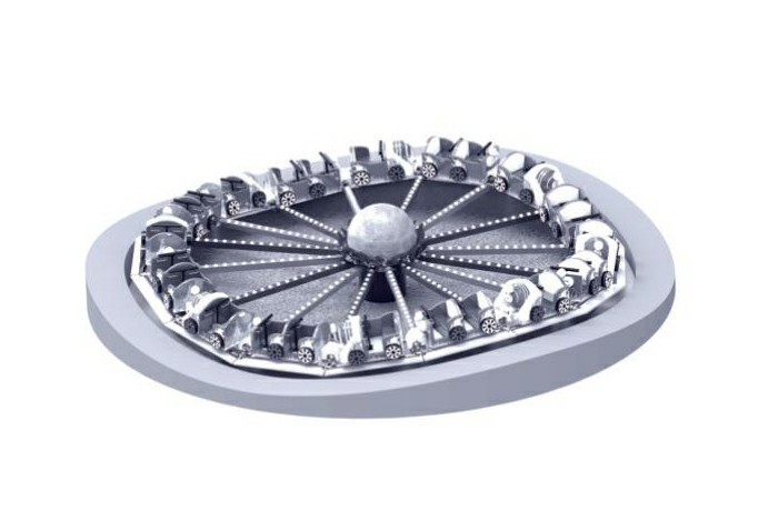 YKC-48B型烈焰戰(zhàn)車(chē),以戰(zhàn)車(chē)追逐恒星為主題,中間支撐座裝有回轉(zhuǎn)支承連接16條轉(zhuǎn)臂。每條轉(zhuǎn)臂自帶行走輪,其中四條轉(zhuǎn)臂帶有驅(qū)動(dòng)裝置,而16個(gè)座艙分別安裝在轉(zhuǎn)臂之間。轉(zhuǎn)臂行走輪下方布置有環(huán)形的起伏路軌,在轉(zhuǎn)臂驅(qū)動(dòng) 裝置的驅(qū)動(dòng)下,烈焰車(chē)體圍繞中心的恒星高低起伏轉(zhuǎn)動(dòng),座艙隨轉(zhuǎn)臂旋轉(zhuǎn)運(yùn)動(dòng) 的同時(shí),并沿路軌上下運(yùn)動(dòng),使乘客體驗(yàn)多重復(fù)合旋轉(zhuǎn)運(yùn)動(dòng)帶來(lái)的樂(lè)趣。