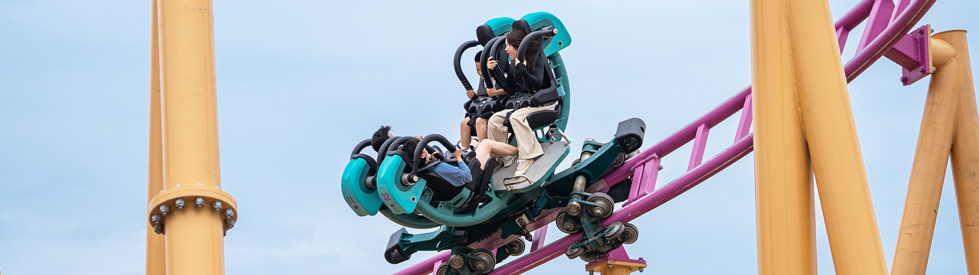 超炫過??將720°螺旋下降、?平螺旋環等元素與?轉回旋?體結合,同時創新地將過??有傾?的路軌引?到?旋滑?的軌道中,打造出兼具失重、超重和回旋的多重游玩體驗。四??體中游客兩兩對坐,促進互動交流。奧德賽歷險創意主題造型吸引著眾多情侶、親?游客前來挑戰。