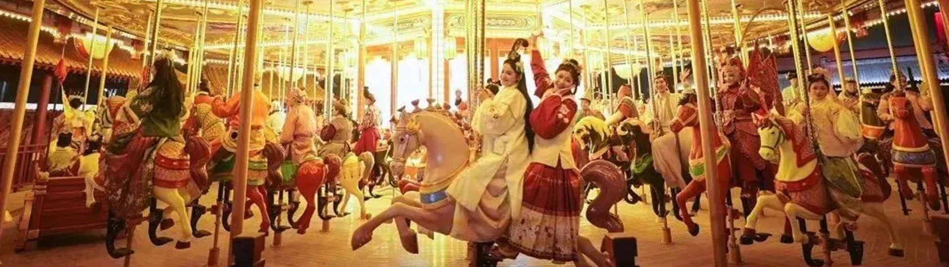 設備通過宋代的建筑整體風格包裝,岳飛的千里骕骦駒帶領岳家軍的軍隊排兵布陣陣列,宋、岳軍隊集結的陣式蓄勢待發。以現代生動的雕刻繪畫手法適當的卡通色彩表達馬匹造型,符合家庭親子游客的游玩審美趣味。讓乘客化身為“背嵬軍”隨岳飛出征北伐,體驗馳騁沙場的感覺。浮雕和絢爛彩燈,馬匹及宮庭式馬車結合多彩的花飾,造型精致夢幻。