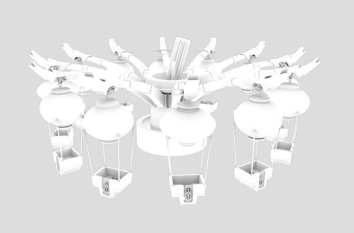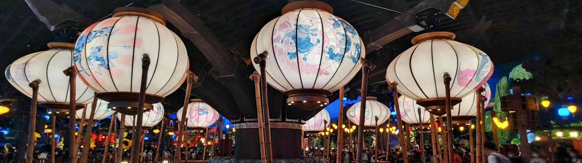 逍遙花燈集旋轉、升降運動形式于一體。在運行過程中,轉盤會以15°的傾?進行旋轉,乘客在吊籃中邊體驗離心力作用下的外擺及高低起伏的回旋飄蕩,邊欣賞燈籠光影變幻下的皮影故事。