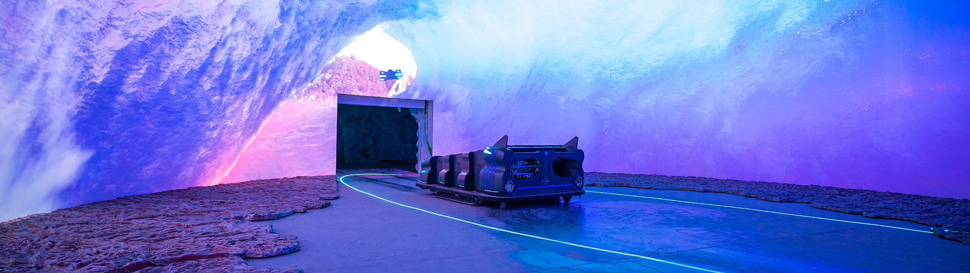 有別于傳統黑暗乘騎項目,擺脫傳統的軌道系統,采用激光測距定位技術,讓游客乘坐在無軌游覽車內,沿著既定故事路線進行靈活穿梭體驗,充滿趣味刺激感。